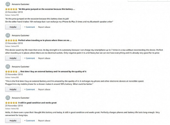 去年年底,亚马逊上第三方销售的Kuppet无线充电器移动电源的评论中,分批上传了几次评论,每批次大约350条。而且许多评论似乎都是从亚马逊上其他充电器的评论中复制而来的。