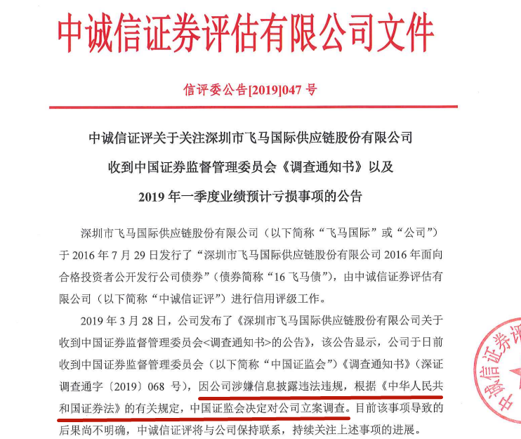 这家巨头企业是深圳市飞马国际供应链股份有限公司,为什么说是巨头企业呢,这家公司是一家上市公司,市值最高的时候高达200亿人民币!可是这样一家巨头企业怎么就被证监会立案调查了呢?据了解,该公司在4月30日发布了《深圳市飞马国际供应链股份有限公司 关于被立案调查进展暨风险提示的公告》。 公告中显示:因涉嫌信息披露违法违规,公司目前正在被中国证监会立案调查。如公司触及《深圳证券交易所股票上市规则(2018 年 11 月修订)》13.2.1 条规定的重大信息披露违法情形,公司股票可能被深圳证券交易所实施暂停上市,请广大投资者注意风险。 深圳市飞马国际供应链股份有限公司收到中国证券监督管理委员会《调查通知书》(深证调查通字〔2019〕068 号),主要内容为“因你公司涉嫌信息披露违法违规,根据《中华人民共和国证券法》的有关规定,我会决定对你公司立案调查,请予以配合。”公告中还显示:该公司股票于2019年4 月30日开市起停牌一天, 并于2019 年5月6日开市起复牌,公司股票自2019年5月6日起被实施“退市 风险警示”特别处理。下图是中诚信证券评估有限公司的一份文件: 据公开信息显示,飞马国际前身是飞马运输,成立于1998年,2003年更名为飞马物流,2006年12月,由广州飞马、赵自军和黄汕敏共同作为发起人,将飞马物流整体变更为股份有限公司,公司的业务为现代物流服务,是深圳市重点物流企业。公司在2008年1月成功在深交所挂牌上市,成为国内第二家上市的供应链管理公司。飞马国际在2月25日披露其2018年的业绩快报,营业收入423亿,同比大幅下跌31%,净利润为亏损19亿,在3月30日,飞马国际公布其2019年1季度的业绩预告,仍然是亏损1.13亿-1.69亿。而飞马国际对于业绩亏损的原因这样解释:1、公司资金周转困难,财务费用大幅增加;2、公司境外子公司恺恩资源有限公司与客户的纠纷对公司业绩产生较大不利影响;3、公司受流动性压力的影响。据悉,截止4月30日,飞马国际涉及诉讼约41起,公司及子公司被冻结的银行账户累计为21户,合计被冻结金额为人民币53,679,655.18元(包括3,051.61美元)。公司及子公司部分银行账户的资金被冻结,已经对公司日常生产经营造成了一定的影响。 如有侵权,违规,请联系我们处理.
