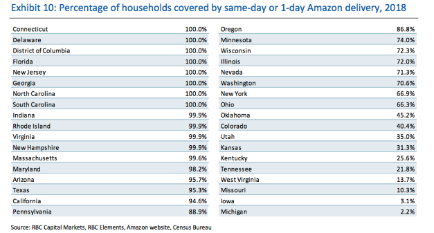 RBC Capital Markets的数据显示,亚马逊已经能够向美国72%的人口提供当日和一天的送货服务,包括16个最富裕、人口最多的州和华盛顿特区的几乎所有家庭(95%或更多)。亚马逊最新的收益报告中表示,它将Prime会员的单日配送设置为默认值。