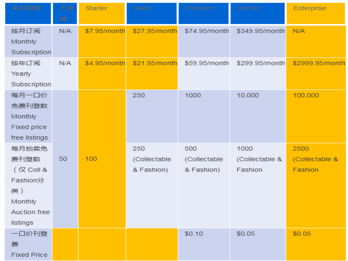在eBay美国站点,eBay提供了5中不同级别的店铺,他们的订阅费如下: