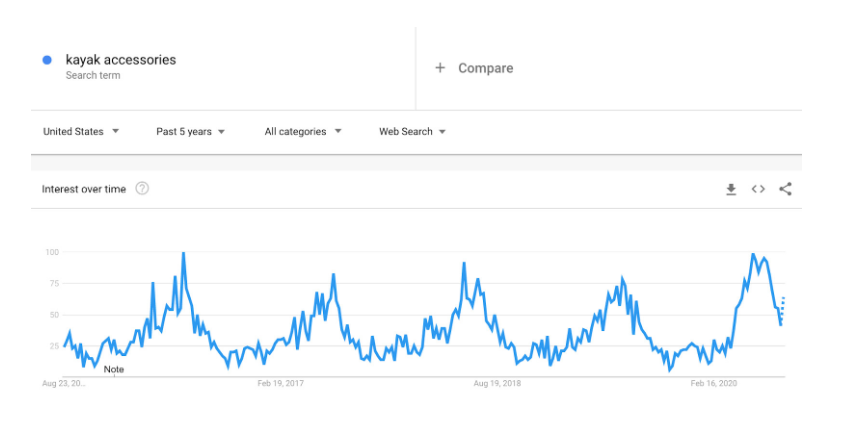 Google趋势描述了皮划艇配件在夏季前的趋势,其在假期后再次上升。