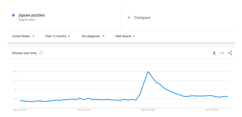 “jigsaw puzzle(拼图游戏)”一词的平均每月搜索量为823,000,很明显,他们正在2020年代卷土重来。在谷歌趋势显示,在政府因COVID-19强制封锁后,人们对拼图游戏的兴趣立即飙升。