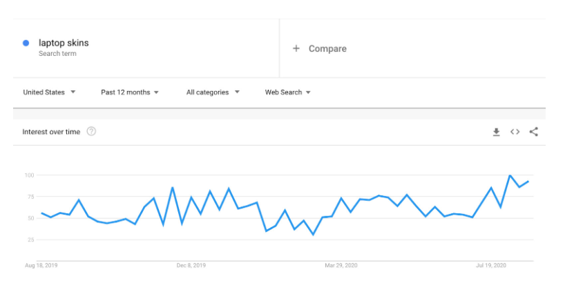 根据Google趋势,搜索字词“laptop skins(笔记本电脑皮肤)”在8月初达到了最高点,然后下降了14点,现在又回到了接近最高点的趋势。