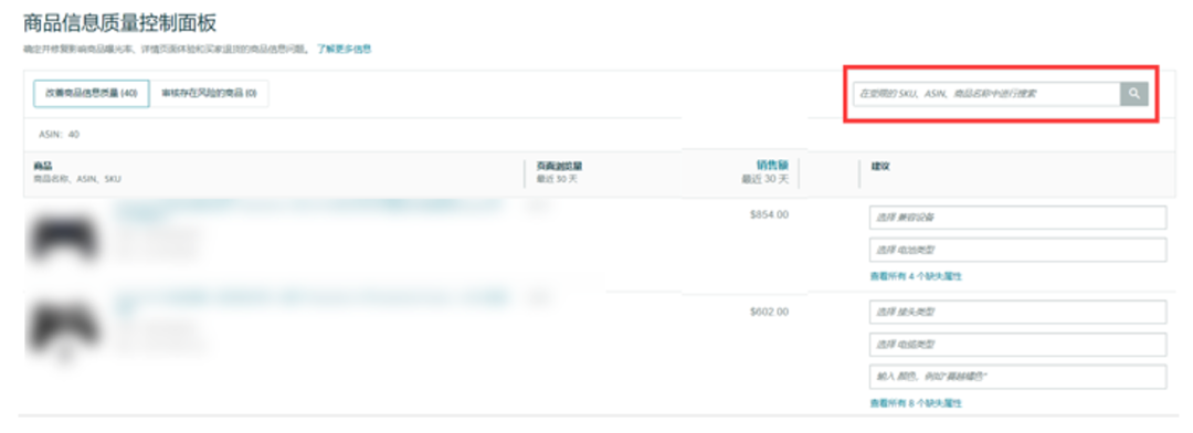 查看需要补充属性值的商品,或者直接在搜索框内输入ASIN号 / SKU号 / 商品标题,找到对应的商品(如果搜索不到结果代表该商品没有需要补充的属性)。